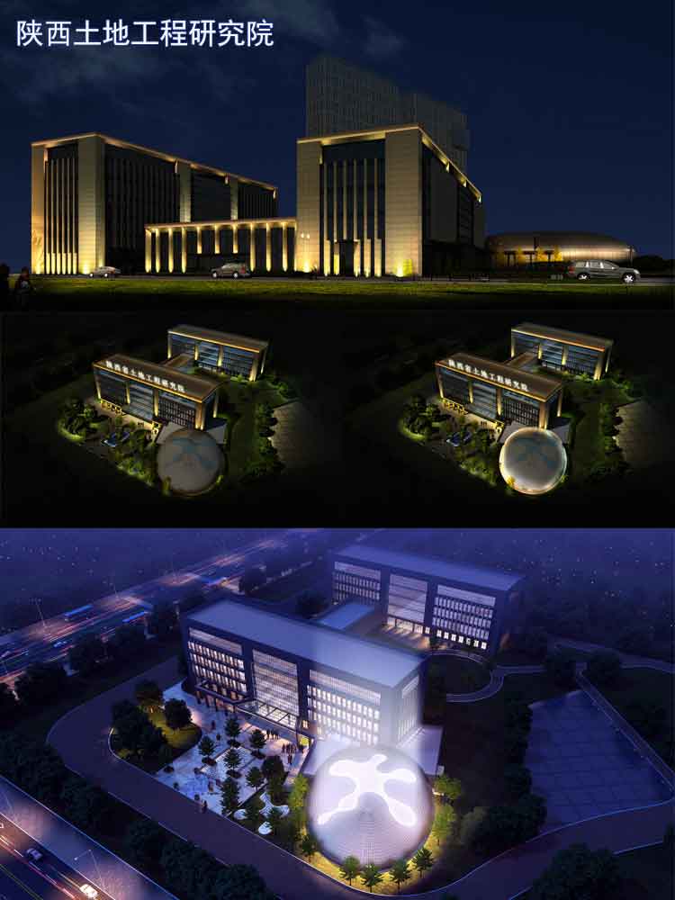陜西土地工程研究院是承擔各類建設工程勘察、設計、土建、安裝、市政、石化、公路、地鐵、機場、礦山、核電、裝飾、鋼結構、古建園林工程施工。對于設計院辦公樓體亮化設計,公司設計師跟根其前后樓體的建筑和廣場的球狀建筑的特點,采用簡單的洗墻燈和投光燈來進行效果設計,彰顯建筑的大氣與威嚴。