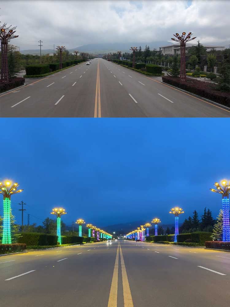 甘肅平?jīng)?米景觀燈項(xiàng)目,安裝位于崆峒山下的市政道路倆側(cè),主光源采用16個LED模組光源組成,配合燈體400的RGB點(diǎn)光源構(gòu)成,系統(tǒng)采用512控制,夜晚整體趁現(xiàn)炫彩效果,亮化倆側(cè)道路。